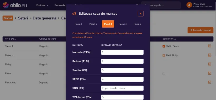Ex. Pentru cota de TVA de 21%, Daisy are ID-ul=A, iar in Oblio corespunde ID-ul=1