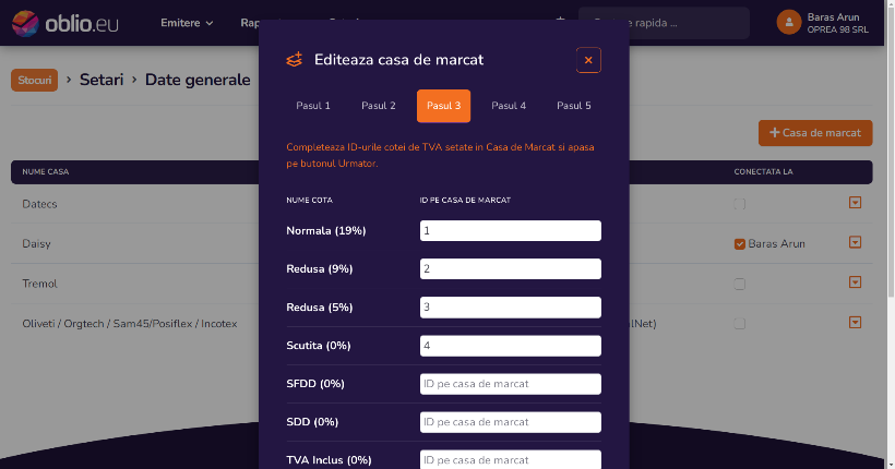 Ex. Pentru cota de TVA de 19%, Daisy are ID-ul=A, iar in Oblio corespunde ID-ul=1