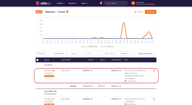 Daca au aparut erori in SPV, in Raport Facturi in dreptul Facturii apare bulina