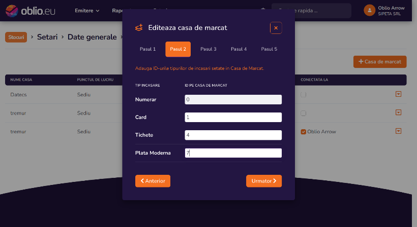 Pentru a putea face operatiuni pe Casa de Marcat este necesar ca utilizatorul de pe Casa de Marcat sa fie acelasi cu cel logat in contul Oblio.
