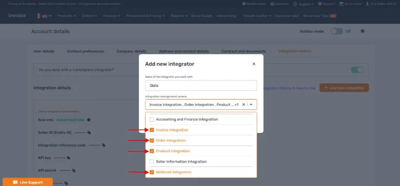 Adaugati Oblio si alegeti Invoice Integration, Order Integration, Webhook Integration, Product Integration apoi apasati pe Save.