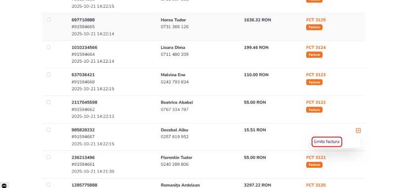 Pentru a emite o factura manual, faceti click pe butonul Optiuni si apasati pe Emite factura.
