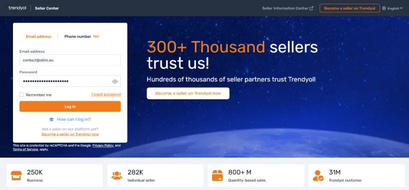 https://partner.trendyol.com/ro/auth/login si apasati pe butonul Log in.