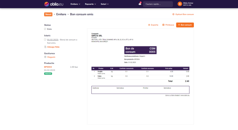 Cand finalizati productia, Produsele finite si Produsele reziduale vor intra automat in stoc pe baza Bonului de productie: