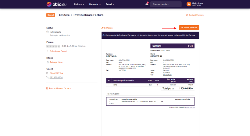 Apasati pe butonul Previzualizeaza Factura si mai apoi Emite Factura.