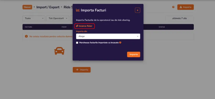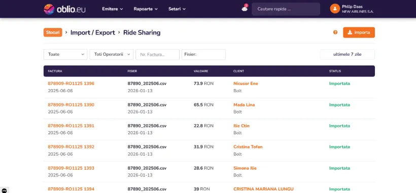 Dupa import, Facturile vor fi afisate in Import/Export > Ride Sharing precum si in Raport Facturi: