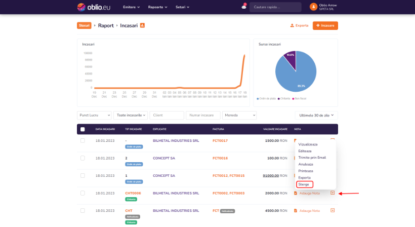 Daca incasarea s-a efectuat cu alt Tip incasare (ex: ordin de plata, card,etc.), accesati Raport > Raport Incasari.