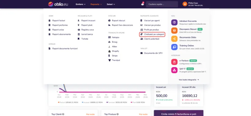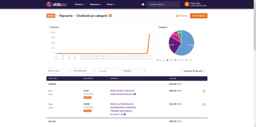 Vizualizati evolutia si structura Cheltuielilor inregistrate in Oblio (Utilitati, Chirii, Servicii, Consumabile, Publicitate, Intretinere si Reparatii...etc) si le puteti filtra dupa tipul de Cheltuieli dorit: