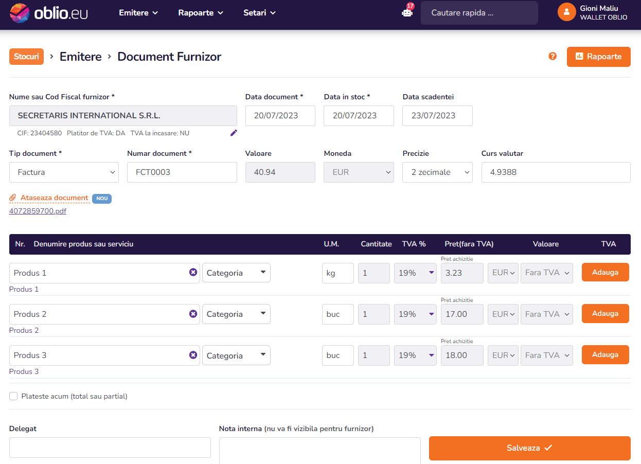 Cu noul Oblio Wallet, primesti automat documentele de la furnizorii tai din "reteaua" Oblio si e-Facturile din contul SPV, pe care le poti introduce in Oblio ca Documente Furnizor.